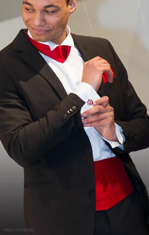 Bei Hochzeiten wird der No-Tie® vom Bräutigam gern in Kombination mit einem Kummerbund getragen. Und besonders bei diesen Anlässen kommt ein oben bereits erwähnter Vorzug des No-Tie® zum Tragen: Die zweite Seite (bzw. Rückseite) des Accessoires kann ebenfalls abgestimmt werden, z.B. auf ein weiteres Party-Outfit oder für die anschließende alltägliche Nutzung.